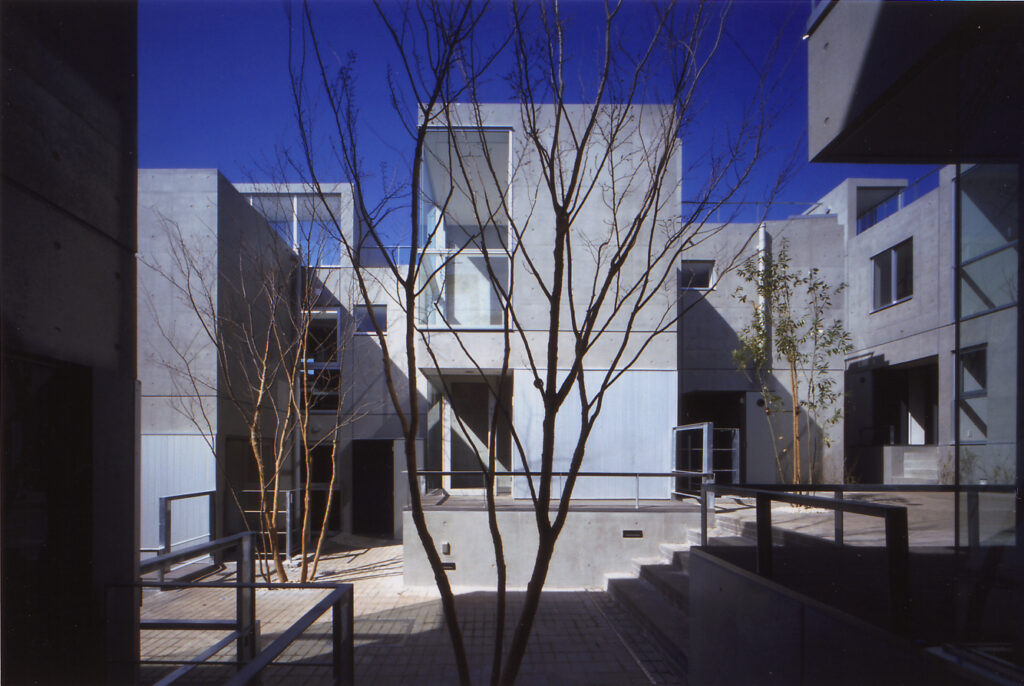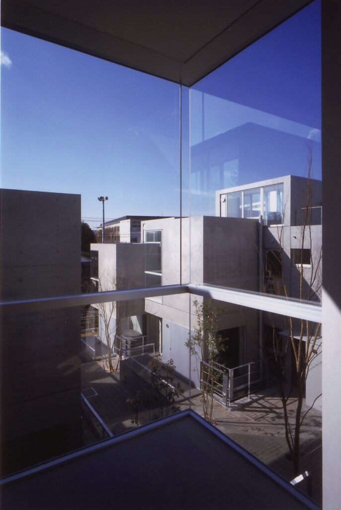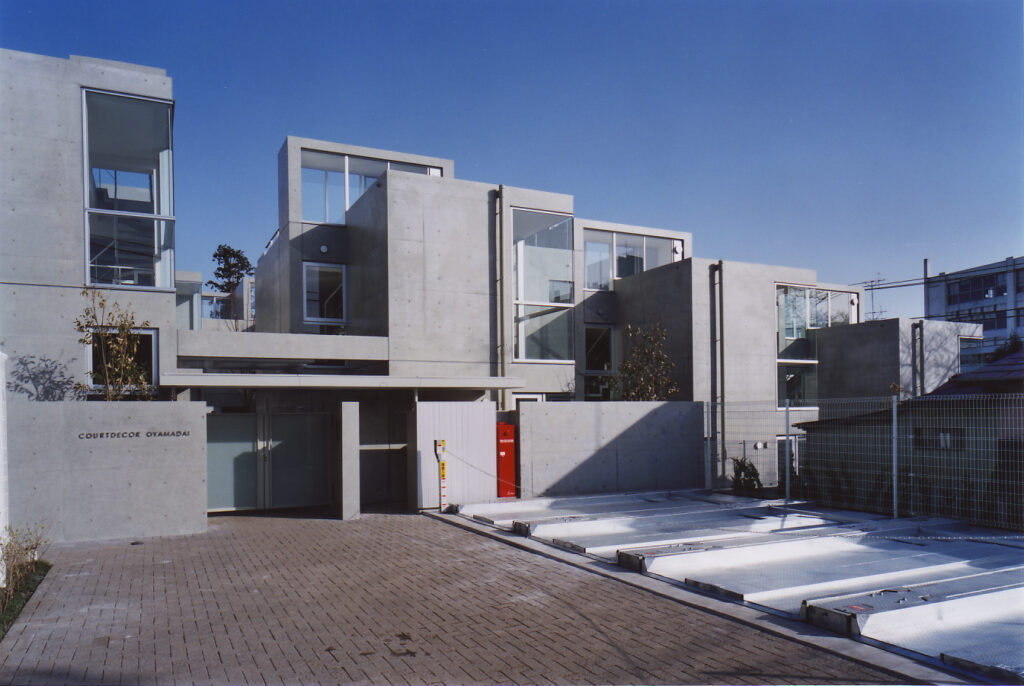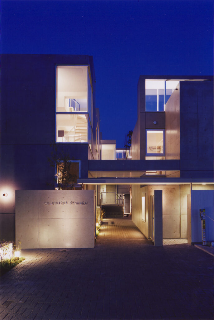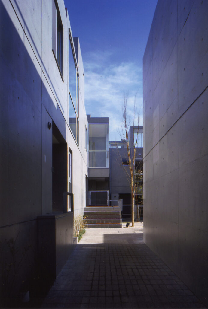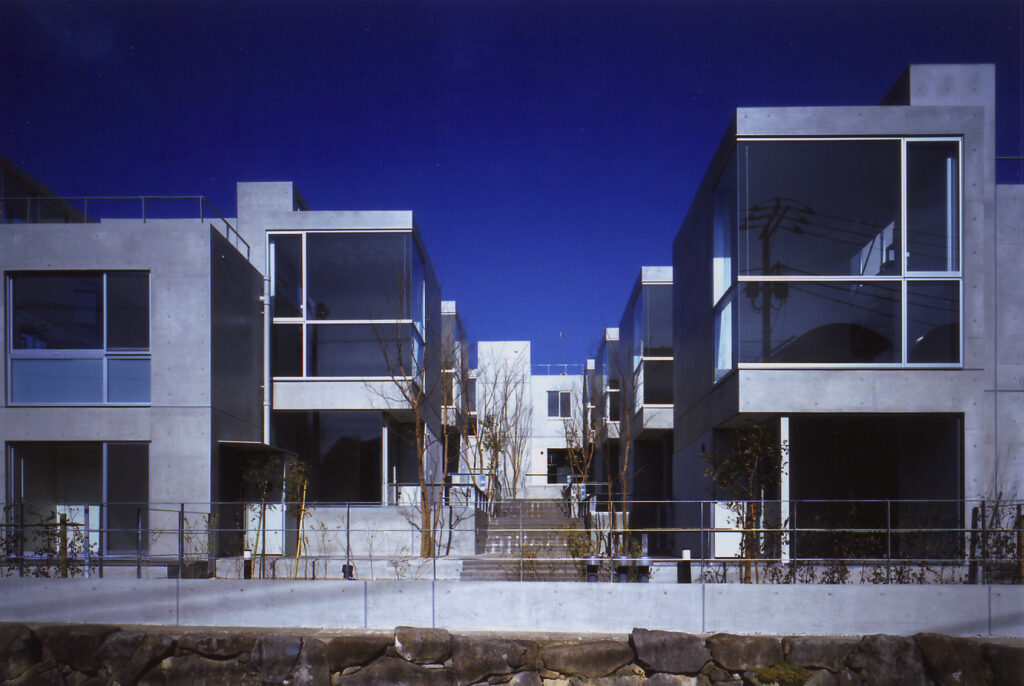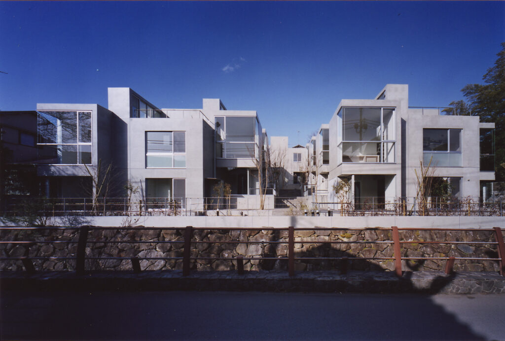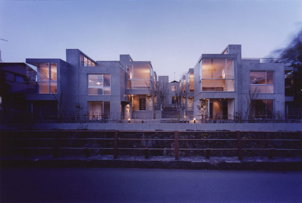 14世帯の住宅をタウンハウスにて設計するプロポーザルコンペで、最優秀案として当選した建物です。敷地の特徴である「緩やかな南斜面」「川に面した敷地」を、高低差を有効に活かした住戸計画にて設計しています。地下1F,地上2F+ルーフテラスから構成する住戸ユニットは、各住戸と適度な間合いを保ちつつ、共に住まうことの楽しさを享受できる関係に設えられていて、周辺環境と呼応したタウンハウスならではの住空間を創設しています。