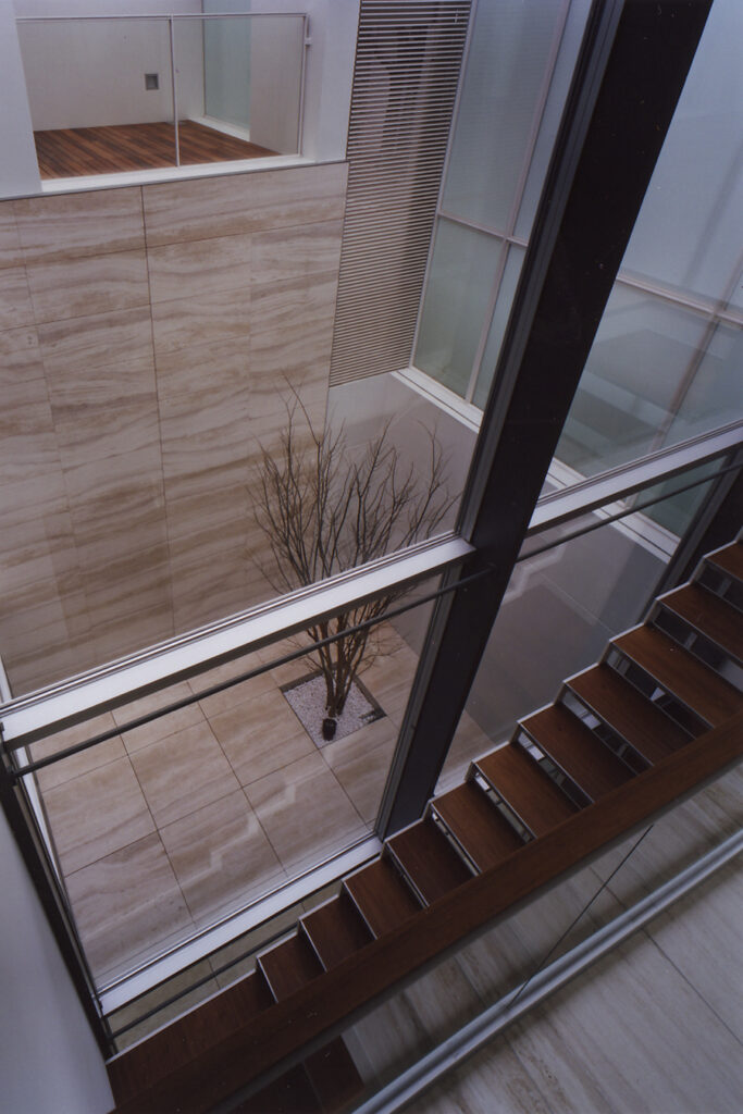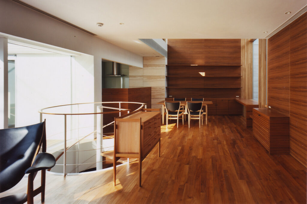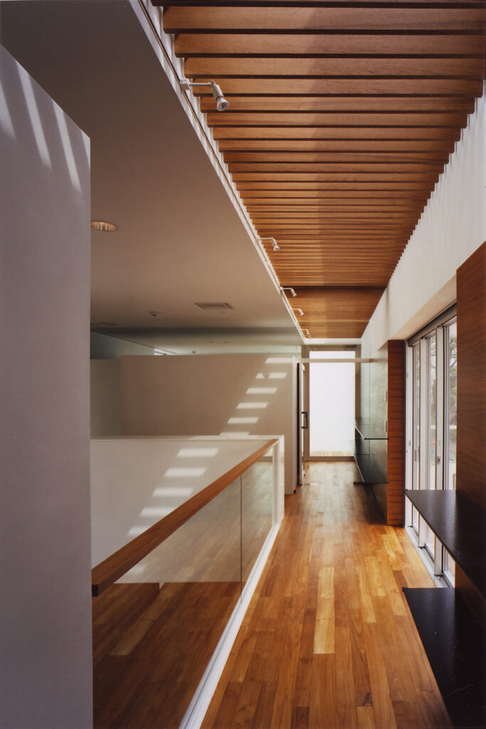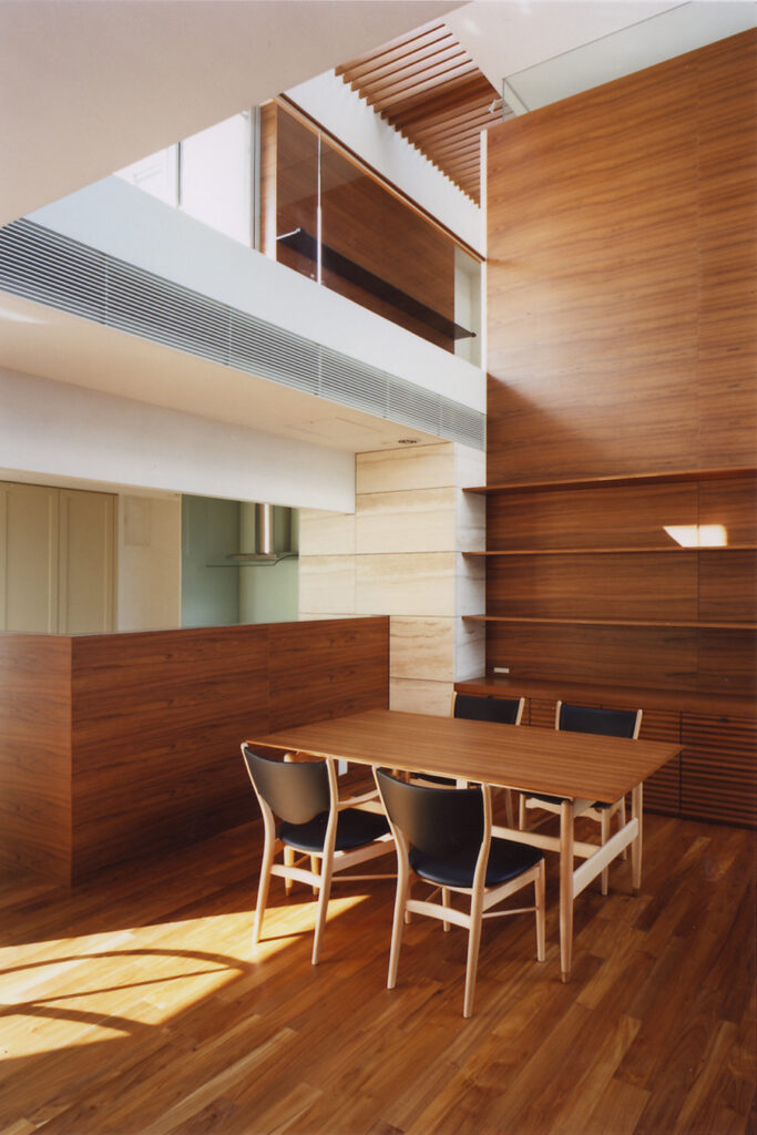 地下1階・地上2階の3層に分かれたフロアーが、幾つかの吹き抜け空間によって有機的に繋がっている住宅です。吹き抜け空間は1層・2層・3層と階段状に連なり、さまざまな外部空間を介して周辺環境と繋がります。そして内部空間には視覚的な奥行感を体感するダイナミックなボリュームが生まれます。木の素材をふんだんに使用したインテリアと光や影、風や音との調和によって、五感を刺激する住空間が完成しています。