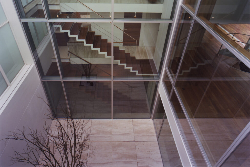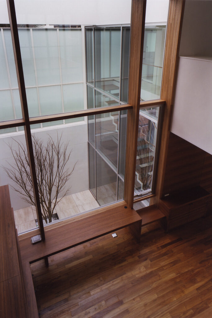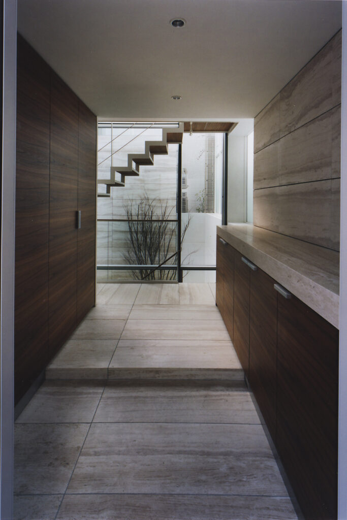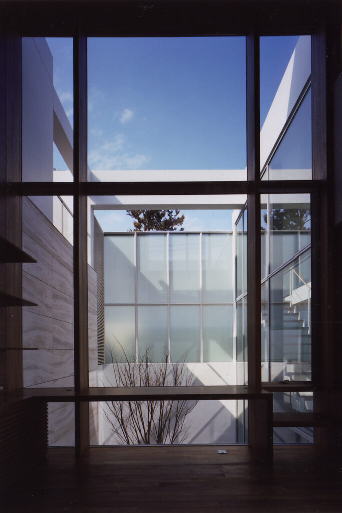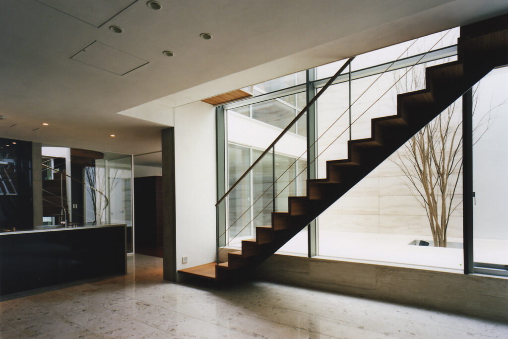 地下1階・地上2階の3層に分かれたフロアーが、幾つかの吹き抜け空間によって有機的に繋がっている住宅です。吹き抜け空間は1層・2層・3層と階段状に連なり、さまざまな外部空間を介して周辺環境と繋がります。そして内部空間には視覚的な奥行感を体感するダイナミックなボリュームが生まれます。木の素材をふんだんに使用したインテリアと光や影、風や音との調和によって、五感を刺激する住空間が完成しています。
